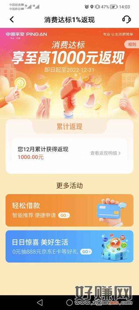 12月的特邀客户,平安消费1000元返现已到账,可以去口袋银行app看看了