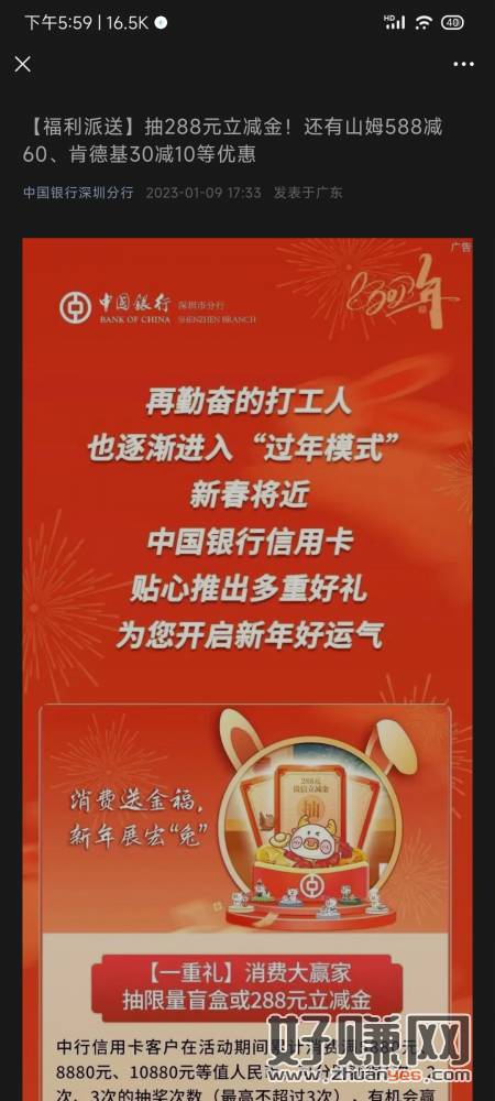中国银行深圳分行推文进限制信用卡