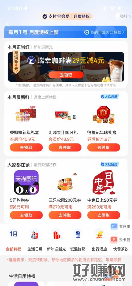 支付宝会员-全部特权-1月特权 可领天猫国际6-5购物金