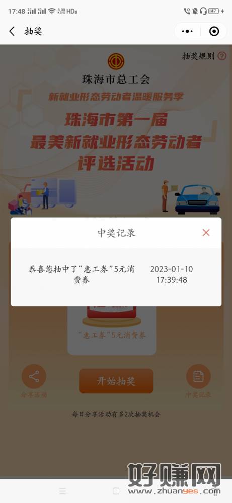 微信小程序搜索珠海工会,进去以后看我发的图那个位置进去投票,然后抽奖,中5元券,怪兽充电t,有点卡,多等会