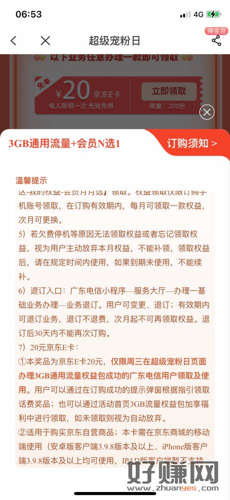 电信订购,现在能领20e卡还有一些东东,买完退订,嫌麻烦就算