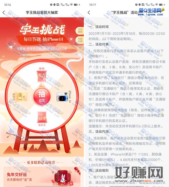 交行字王挑战答题抽1.88-4.88元支付券/手机实物