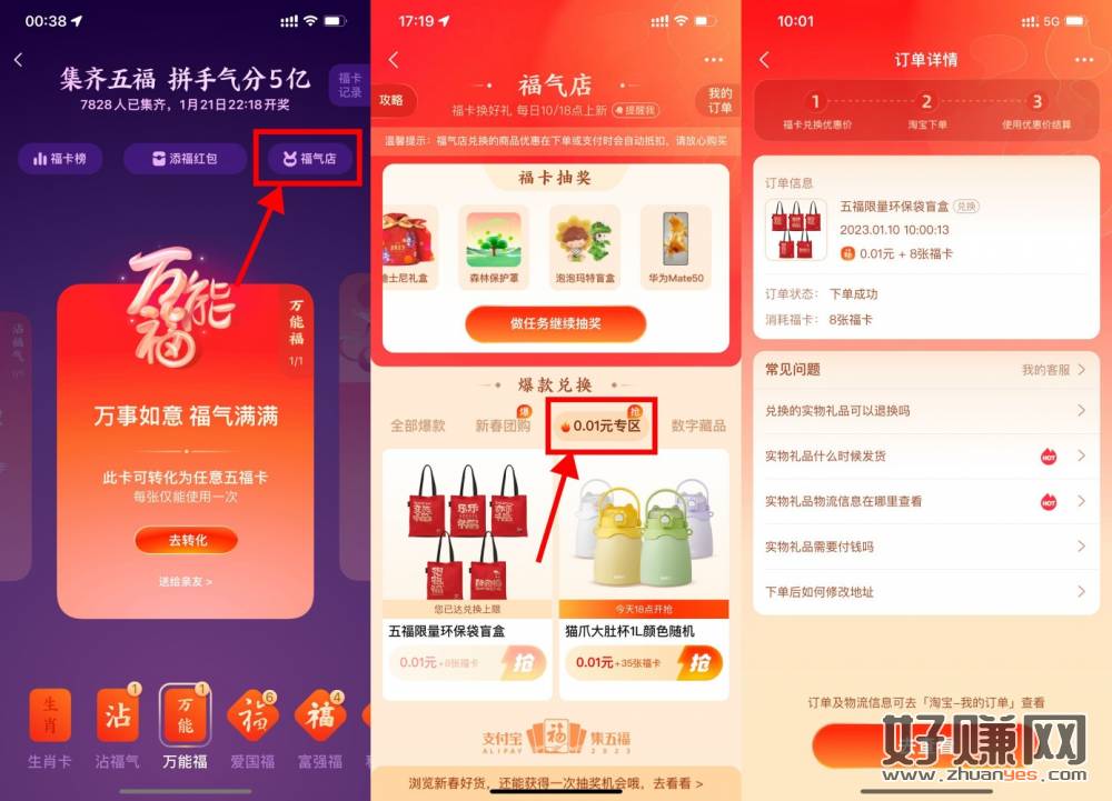 【支付宝福卡兑换0.01实物包邮】18点准时上!支付宝五福活动页面->我的福卡->右上角福气店->0.01元专区->指定数量福卡+0.01元兑换实物包邮