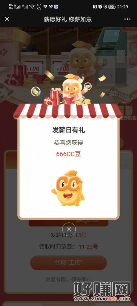 中了10元e卡和666豆,速度。工资日我选的15号。