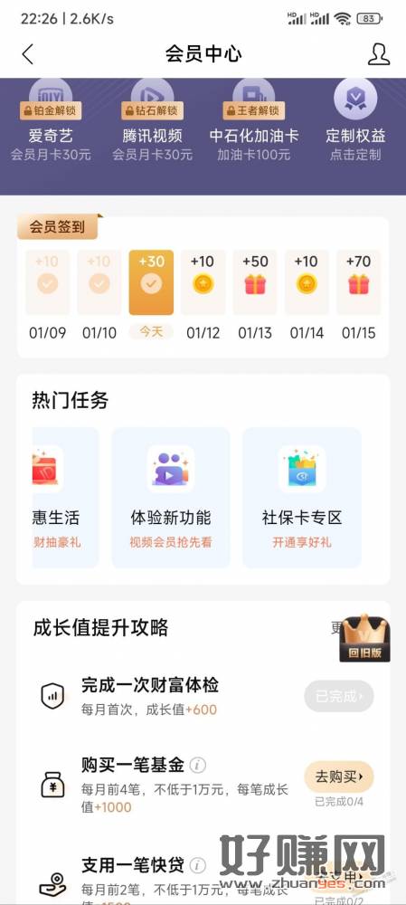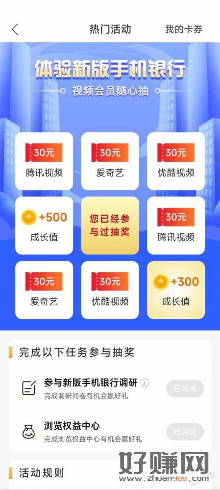 建行app。。会员中心。。签到下面的热门任务。有四个任务,后面两个比较简单,浏览就好了,奖品有视频会员或成长值,必中,我中的是成长值,自测