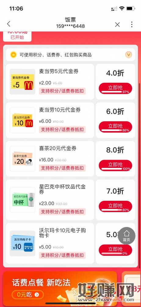 中国联通App-首页-饭票-周四秒杀节,5买沃尔玛10