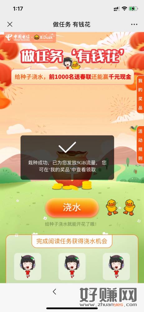 公众号推文,进去第一个任务,点一下浇水就送流量,电信去