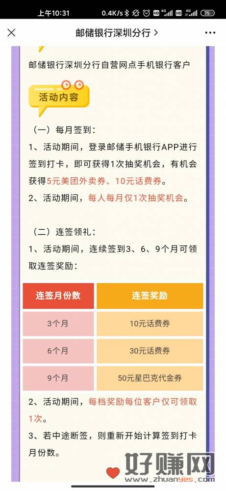 1、活动期间,登录邮储手机银行APP进行签到打卡,即可获得1次抽奖机会,有机会获得5元美团外卖券、10元话费券。