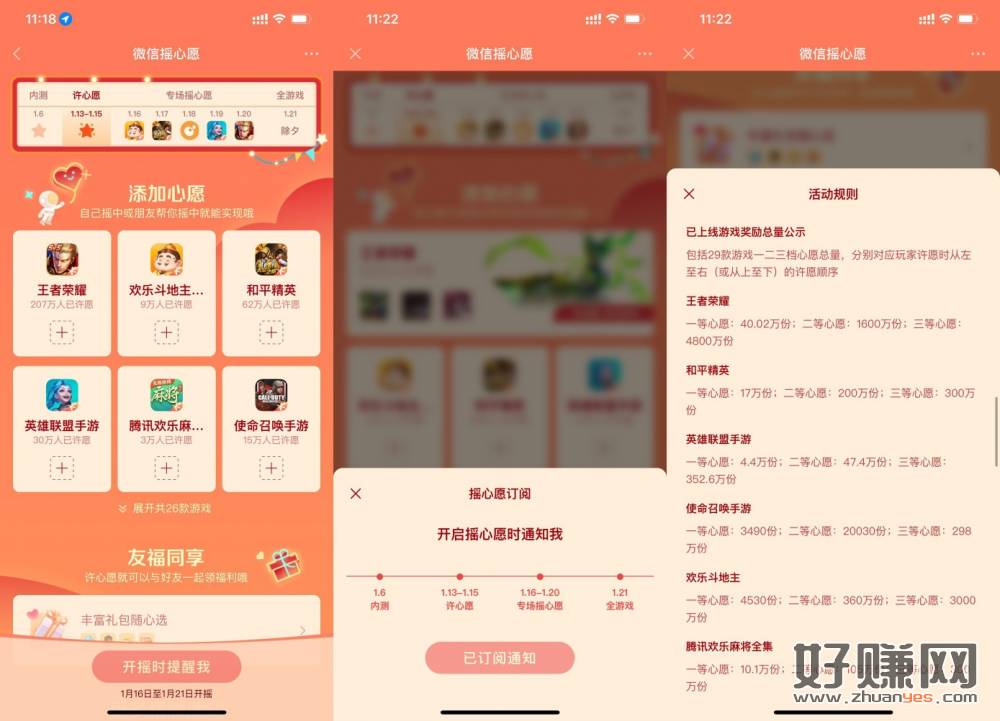 【微信摇心愿抽游戏皮肤或道具】一年一度的微信摇心愿开始啦,目前是添加心愿阶段!微信打开地址,选择游戏并添加心愿,等1月16日~1月20日开始专场摇心愿,必中游戏皮肤或道具角色等!