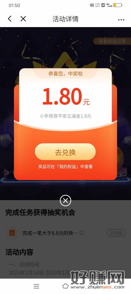 光大银行限广州,权益服务小年夜夜平安活动,低保1.8立减金最高88立减金看谁运气好,我只抽了1.8有点背。