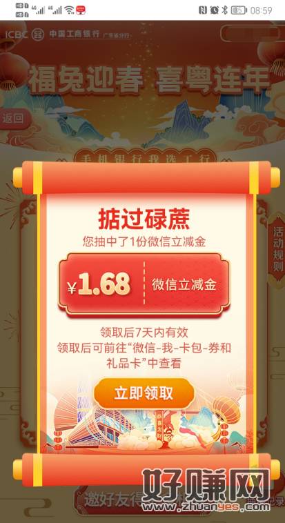 路径:工行APP-生活-本地服务-福兔迎春 喜粤新年(或者登录看看有没有弹窗)翻牌即可,现在有丢丢卡。
