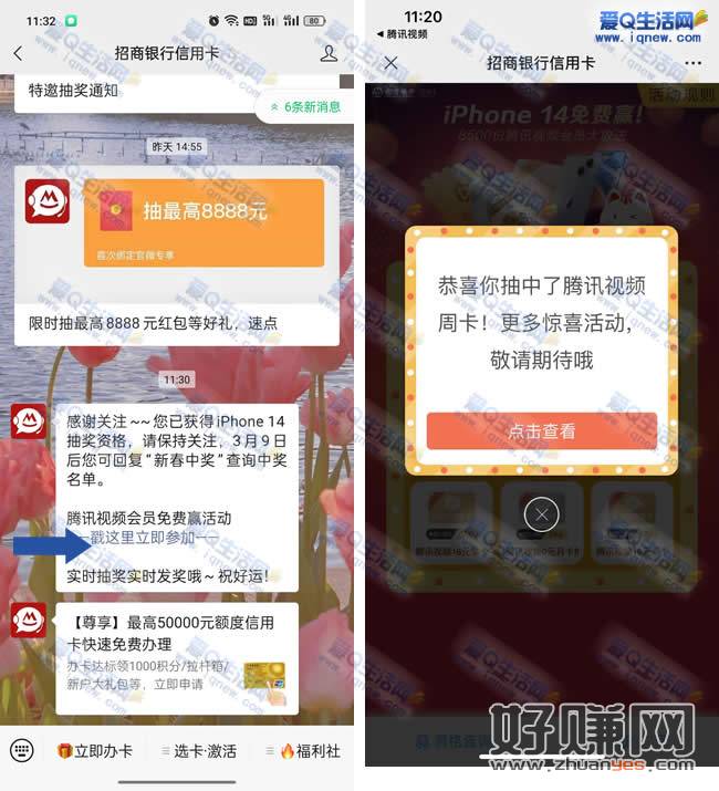 亲测中腾讯视频周卡兑换秒到 招商简单抽奖即可