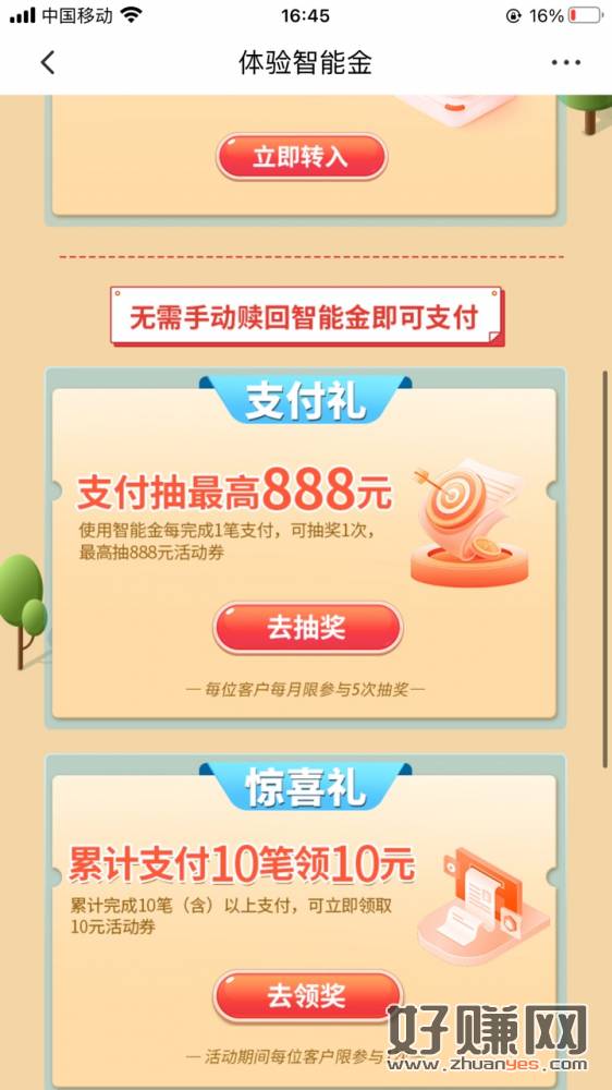 前几天新开的广发银行做了体验智能金的任务不能领奖的现在重新去做,已经问过了说是刚开卡的原因,这个不限制金额,直接卡上留1然后充值1到体验金,随便扫个商户码微信支付10个0.1就行了,再去支付礼,惊喜礼抽奖