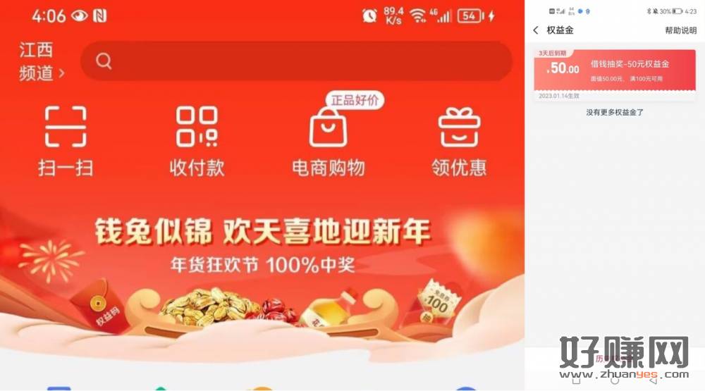 翼支付首页横幅钱兔似锦抽奖 进去浏览一下借钱页面 就有一次抽奖机会 有几率中50权益金 中后扫自己支付宝无损