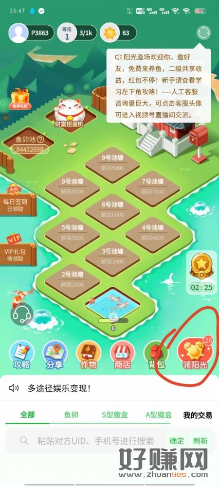 进去领新人礼包可以获得900多鱼卵,玩到1000去抽奖,基本都有5元左右,目前秒到,左上角新手礼包领了,种的鱼产几分钟就够1000了,然后扭蛋机抽奖,然后兑换成现金提现,人人可撸