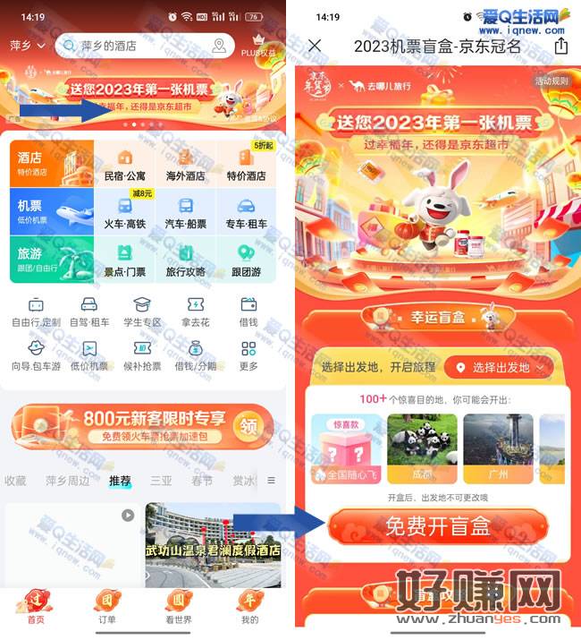 去哪儿APP-首页顶部滚动横幅【送您2023年第一张机票】选择出发地点 盲选到达地点