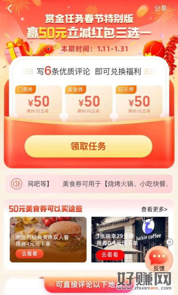 1月11日一1月31日在高德地图搜赏金任务,写6条评论即可兑换50元美食券
