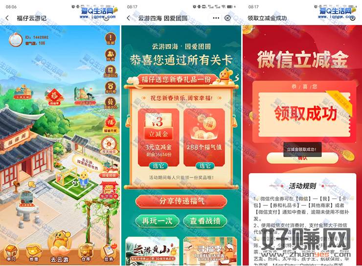 可选3元微信立减金/288个福气值二选一,亲测3元立减金秒到,奖品数量有限速度参与