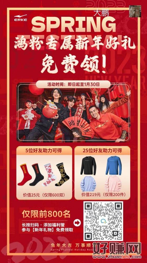 鸿星尔克,5个助力送袜子,25个送卫衣