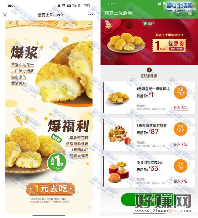 1元吃德克士奶香芝士爆浆鸡块 消费10元叠加使用