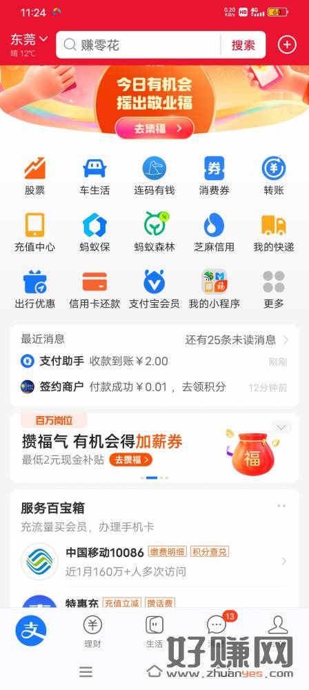 支付宝首页有百万岗位这个界面的去,做五个浏览福气任务,得2块钱。