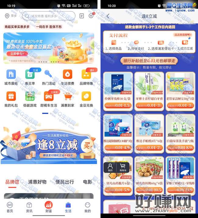 浦发银行APP-底部【生活】-中间【逢8立减微信支付随机立减4-99元】-微信支付的时候需要选择浦发借记卡支付