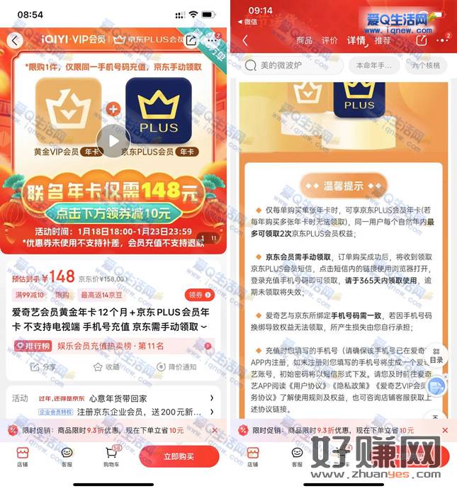 这个活动在京东里面可以直接购买,148元可以撸爱奇艺黄金会员年卡+京东PLUS年卡价格是挺不错的