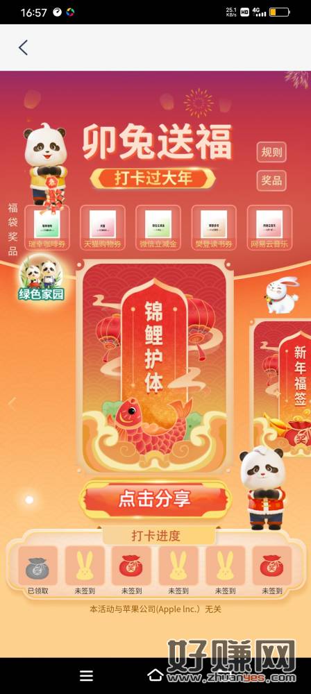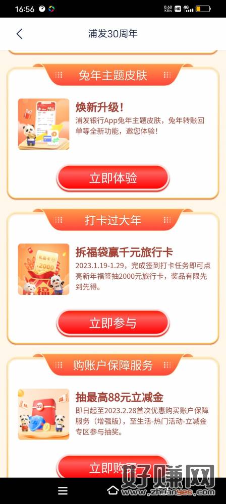 浦发银行首页找这个界面点进去,找打卡过大年进去做打卡任务抽奖
