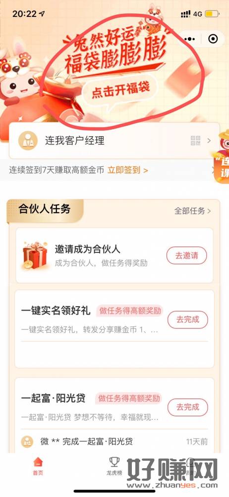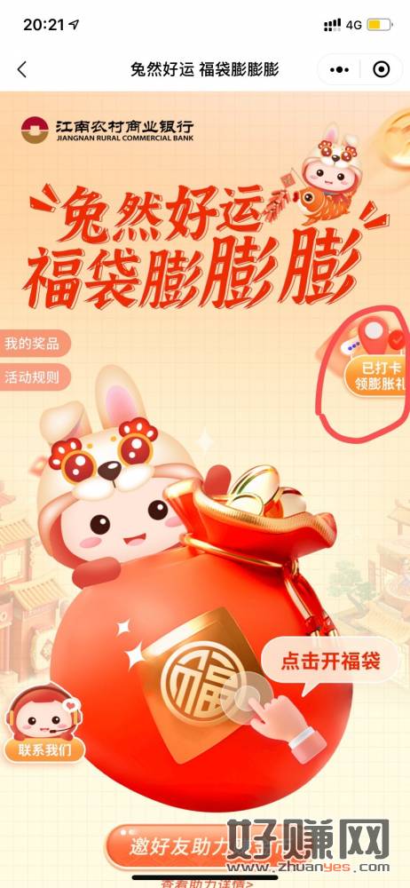 小程序搜江南农商行连我合伙人 首页横幅进入开福袋和右上膨胀礼