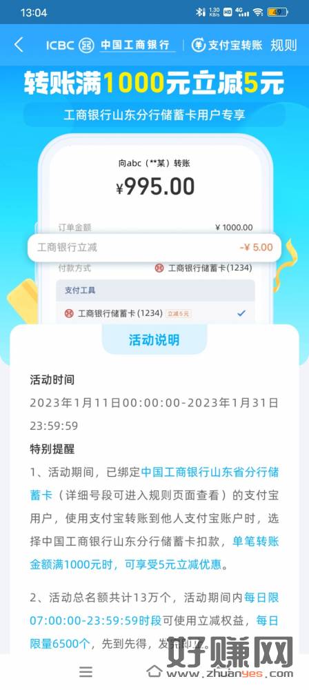 有山东工商银行卡的去,支付宝转账给小号,1000减五。