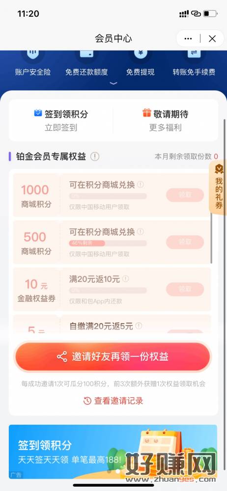 首页横幅一积分兑换铂金会员,领取会员权益充20话费反5块现金,或者换1000积分,兑换大米,香油自己选