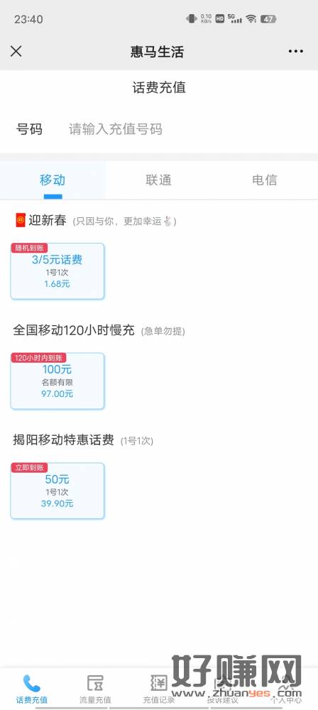 惠马生活公众号,移动话费小羊毛,1.68充随机到账3或者5元