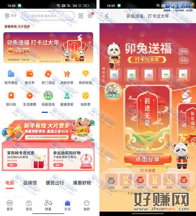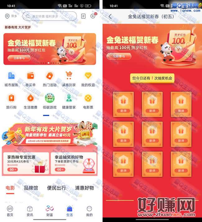 3.浦发银行APP-底部【生活】-顶部滚动横幅【金兔送福贺新春】去抽奖即可