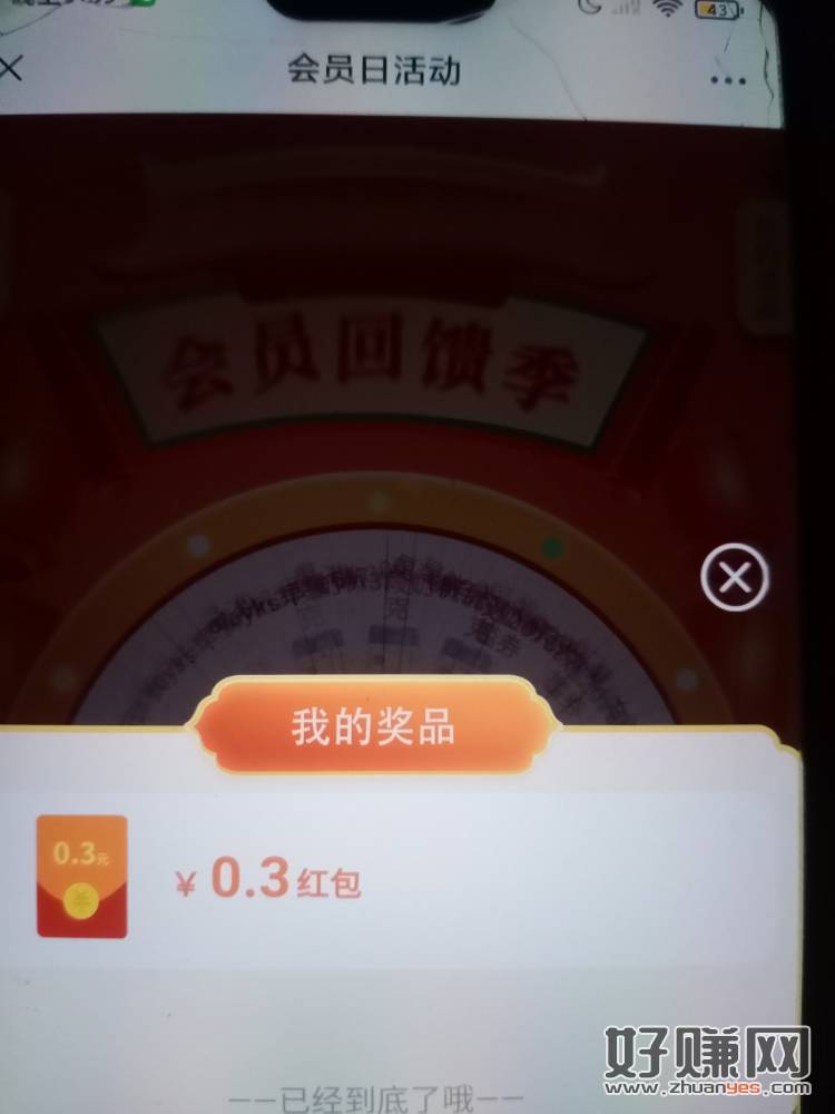 飞鹤直接抽狂点 抽奖(转盘转不停 ,但是没转完,也提示到账,看我的奖品有0.3)