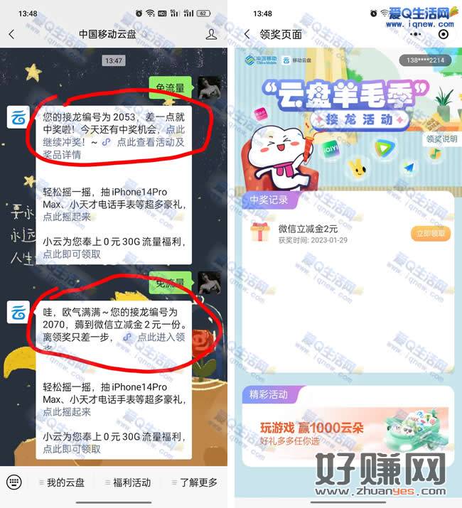 1.微信搜索【中国移动云盘】公众号-发送【免流量】编号为5的倍数和100倍数中随机会员,3次抽奖机会 没有中就多发几次