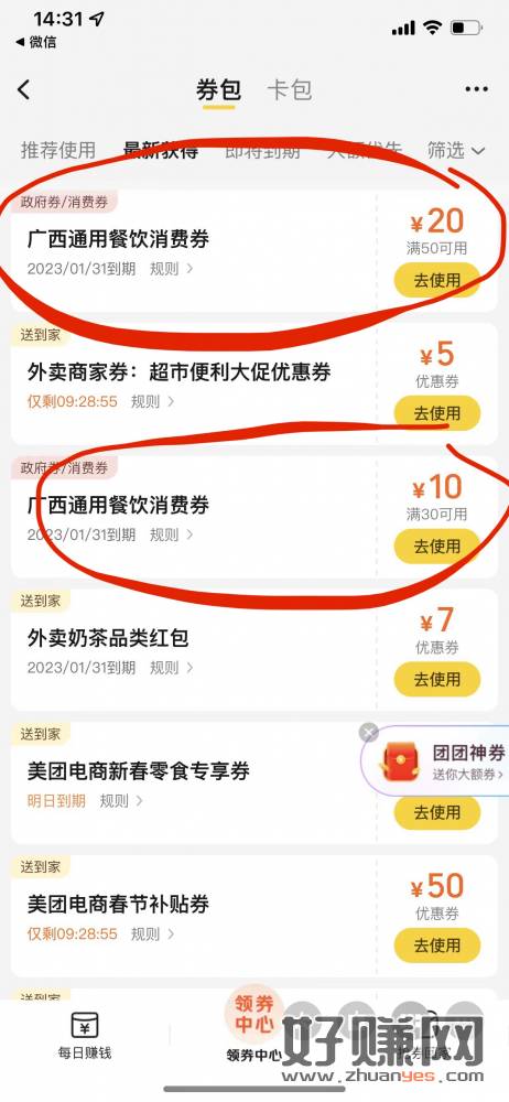 美团——外卖——上方横幅领50-20和30-10支付券,仅限广西地区