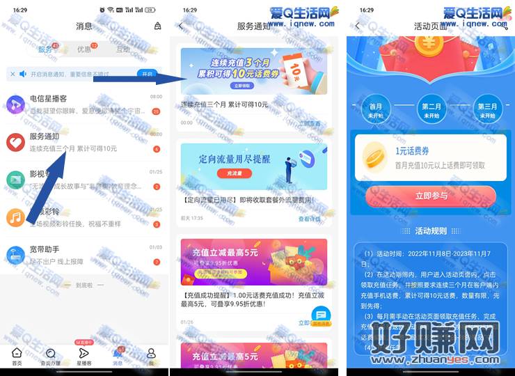 1.电信app-消息-服务-服务通知-【连续充值3个月累积可得10元话费券】