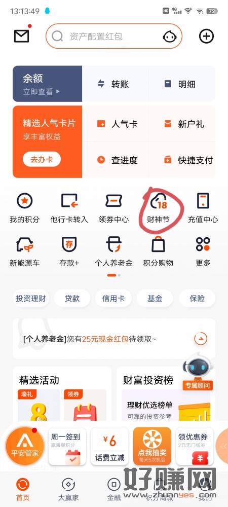 这个之前做了任务的现在可以去提了 打开平安口袋银行首页财神