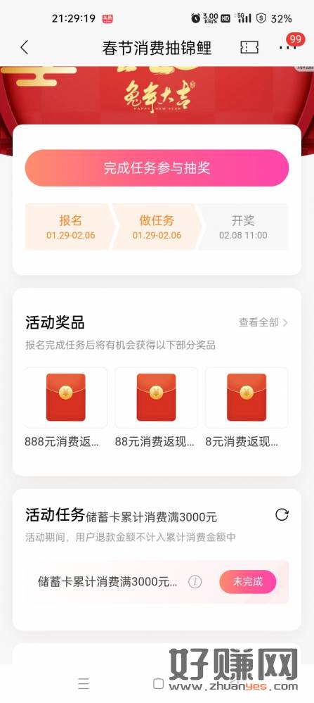 招商银行APP横幅,招商卡消费3000元,2月8日抽奖。可以
