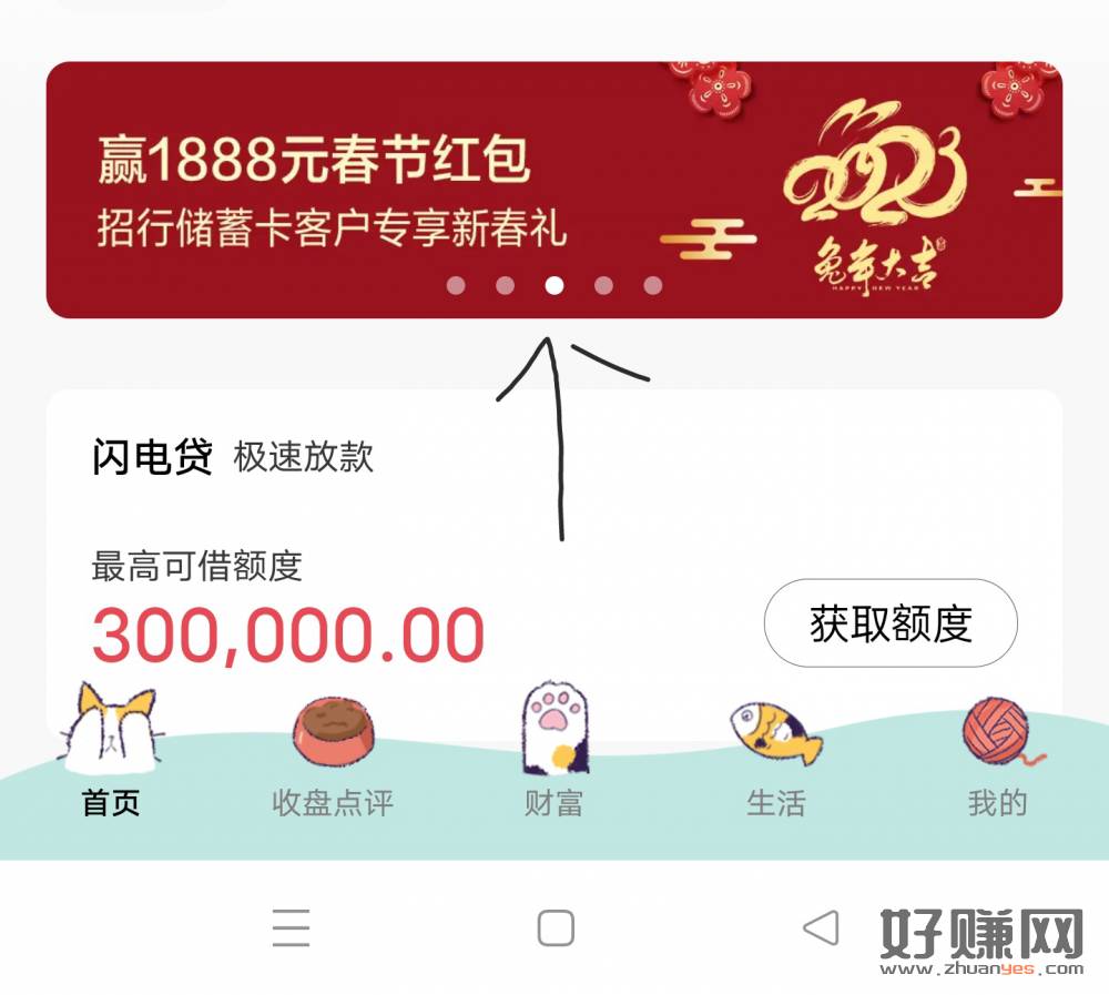 招商银行APP横幅,招商卡消费3000元,2月8日抽奖。可以转入余额宝。