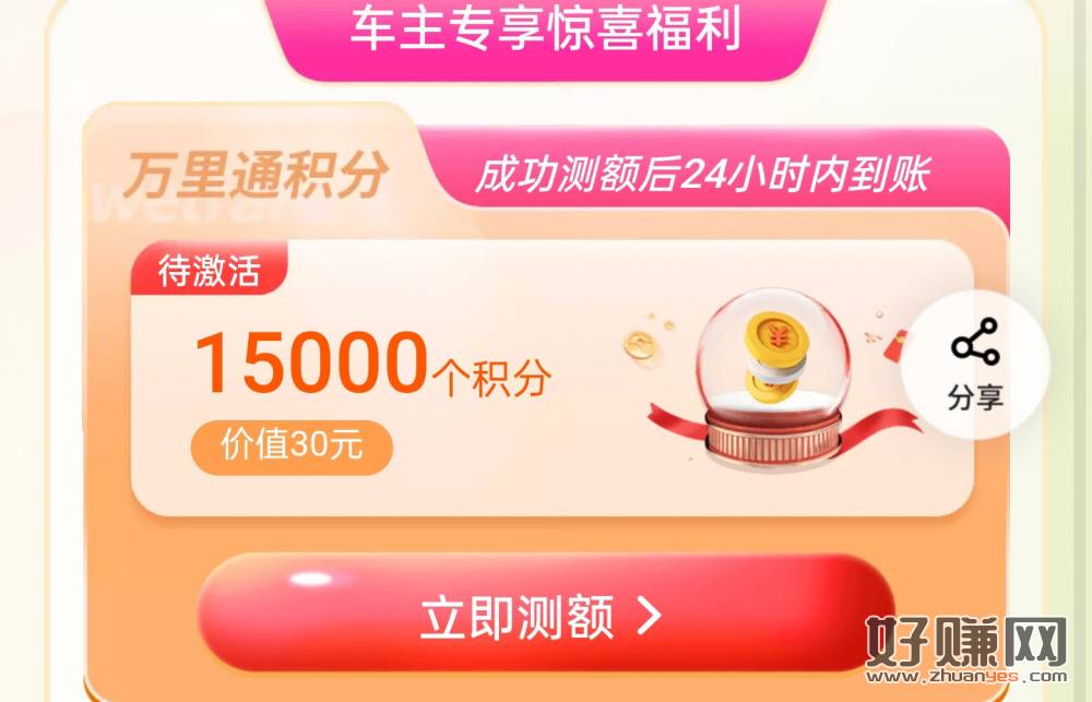 平安口袋银行APP开通车主贷,赠送15000积分(30元),