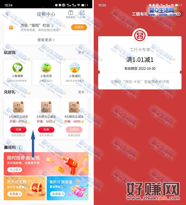 工商银行APP-搜索【任务中心】-下拉至底部-兑好礼-兑换立减金
