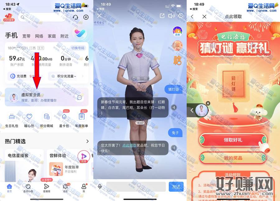 活动地址:电信营业厅APP-首页-虚拟营业员进入-输入猜灯谜发送