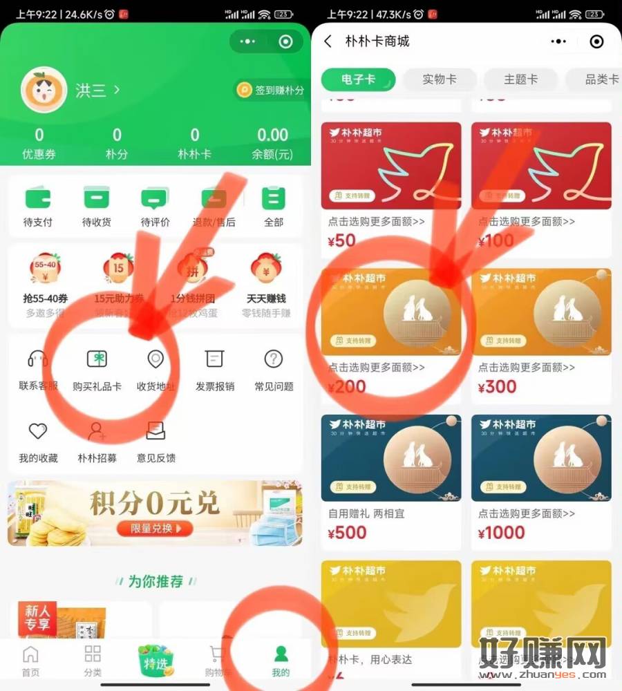 朴朴App~我的~朴朴卡~购朴买朴卡~选择200面值~微信付款~工行随机减立最高188~