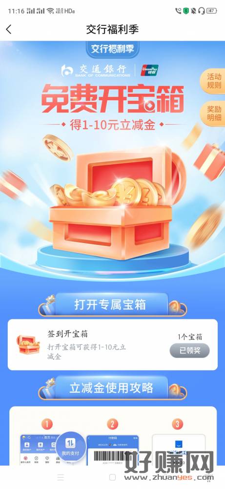 交行扫码,2个开宝箱活动,抽1-10贴金券。