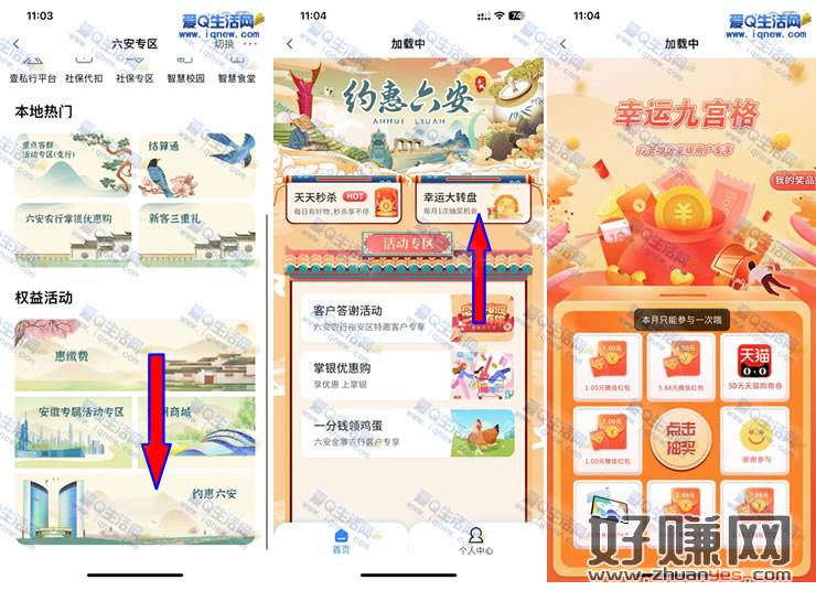 农行APP-搜索【城市专区】-位置切换到六安专区-下拉【约惠六安】-幸运大转盘,支付1分钱抽奖