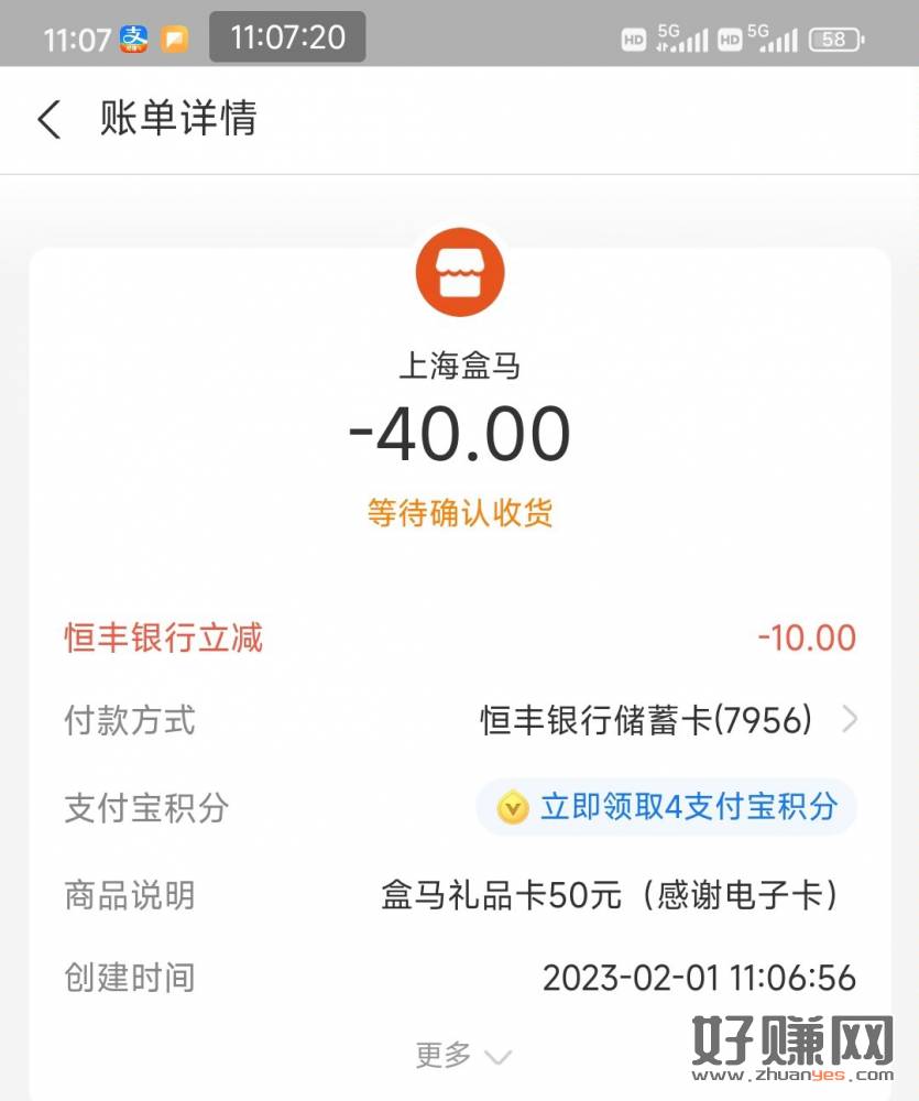 恒丰银行卡(含电子)绑定支付宝 盒马App买50盒马礼品卡 50减10优惠 7润左右