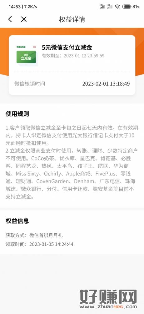 光大上个月领了首绑微信的5元立减金的 今天可以去换了 别忘了 去看看权益里面 待领取有没有