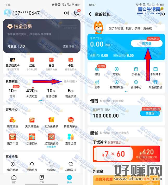 饿了么APP-我的-我的钱包-去充值(显示充值赠送即可参与)
