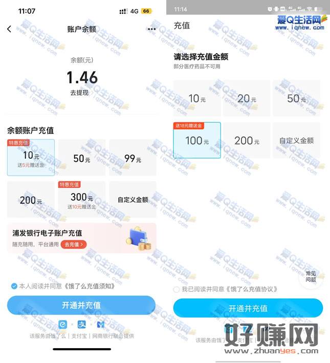 饿了么钱包10充15元/100充118元 需要浦发银行电子账户